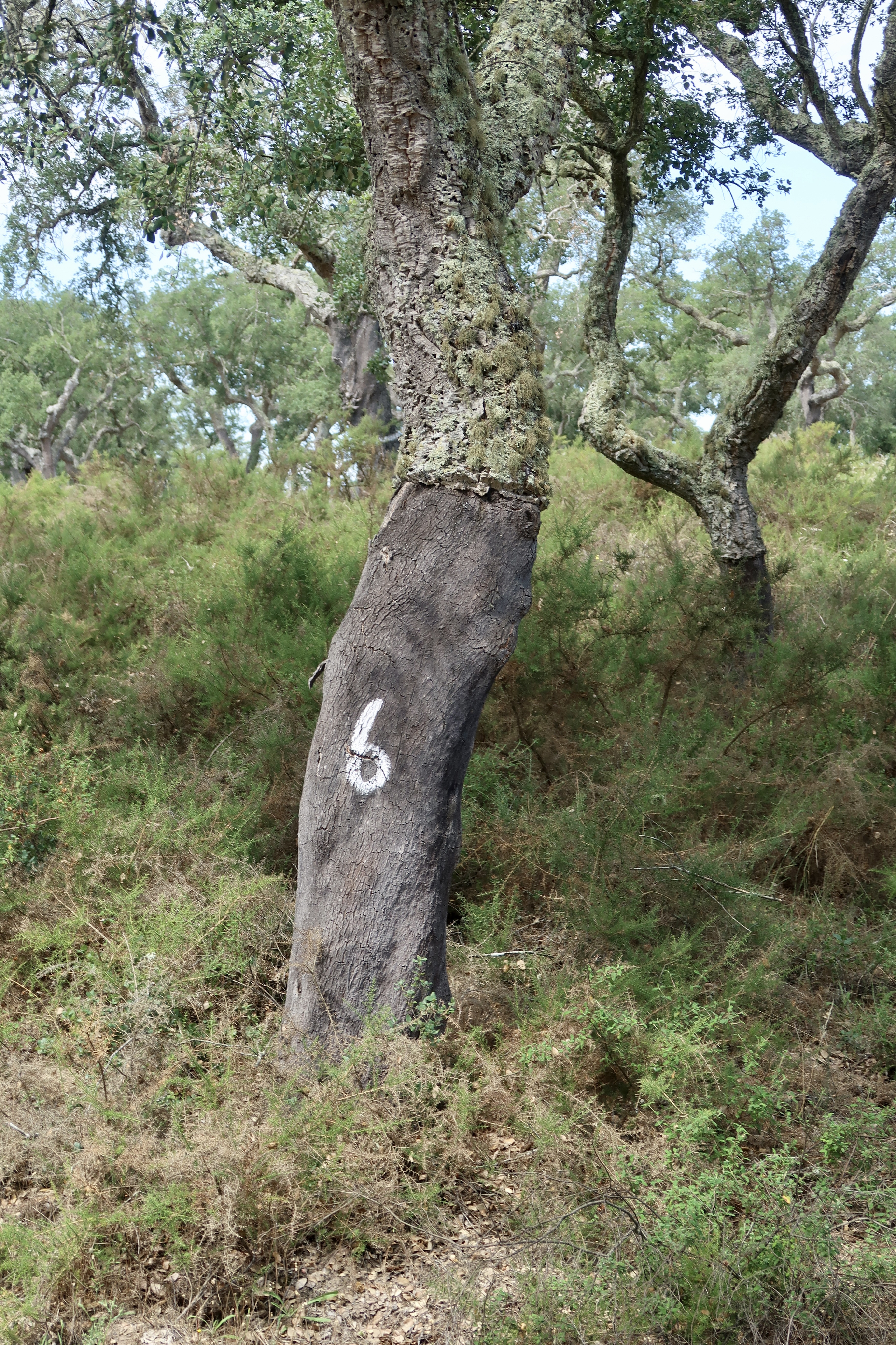 While chugging through the forest, we saw numerous cork-oak trunks stripped of their bark, naked up to their branches. Large single numbers were painted on the wounded boles.