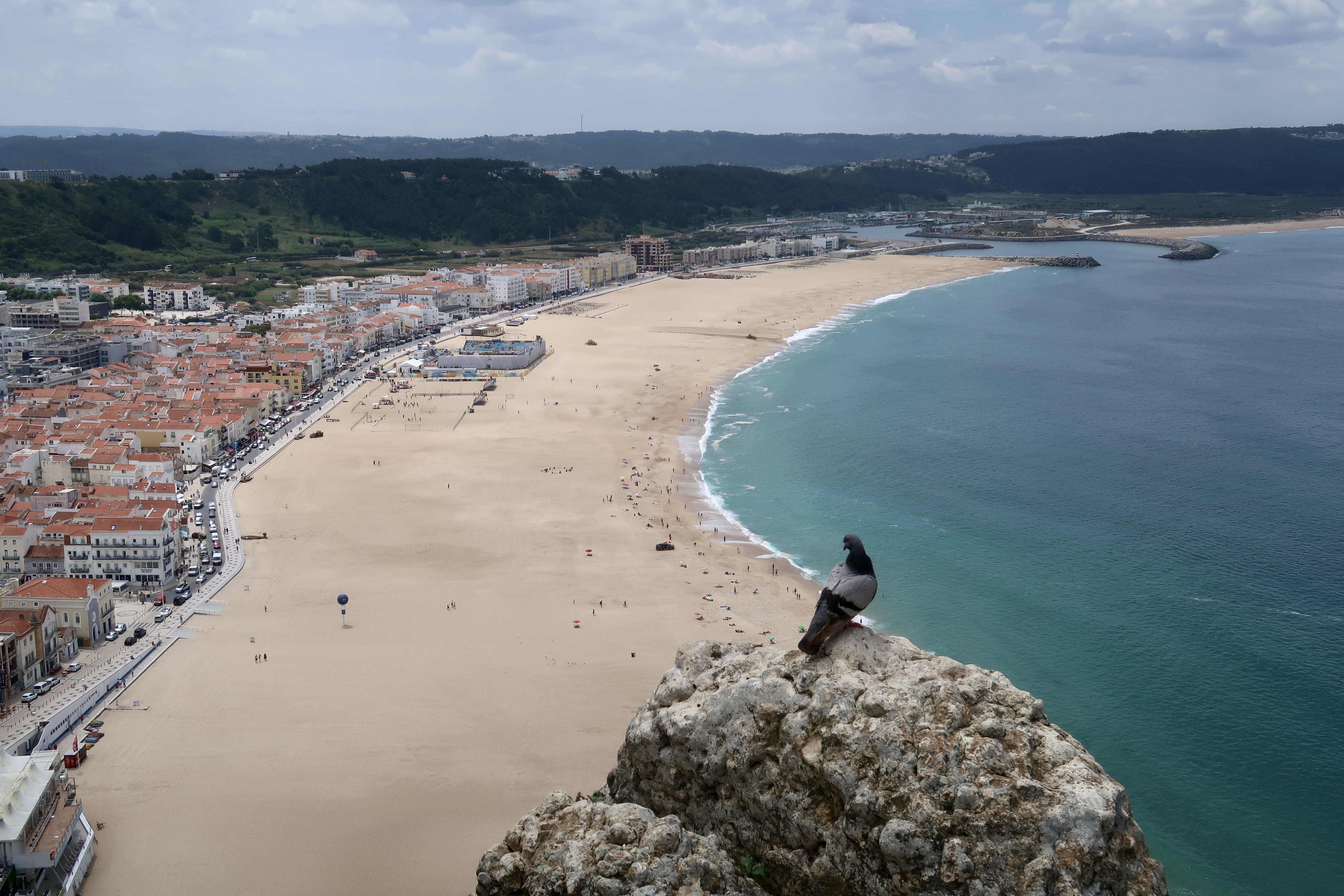 From the cliffs of the tiny village of Sítio (SEE tee oo), the view is expansive. Below is the sleepy town of Nazaré (nah zah RAY) and its broad curving beach. Atlantic Ocean waves pound the shore, while families picnic in the sand.